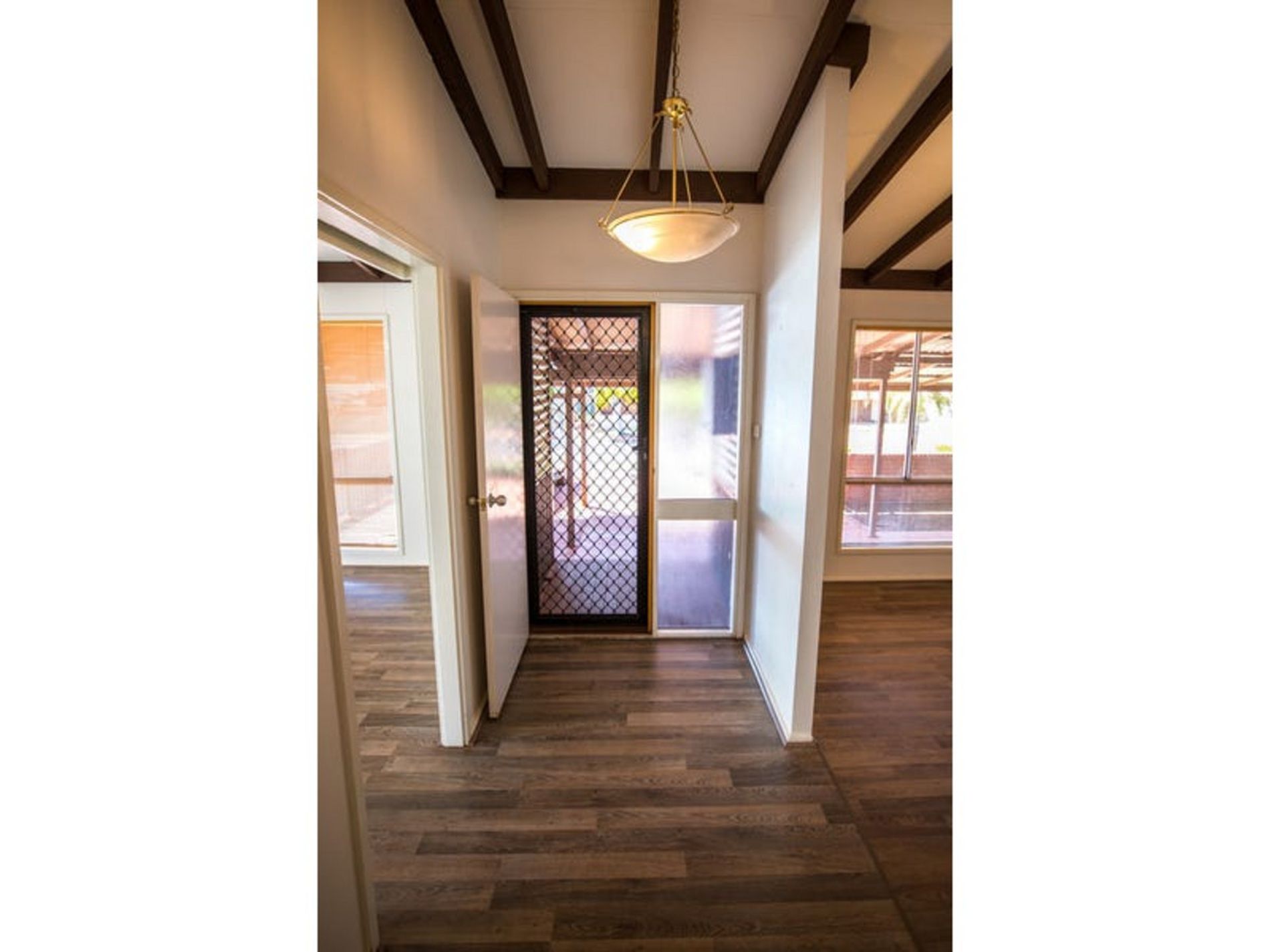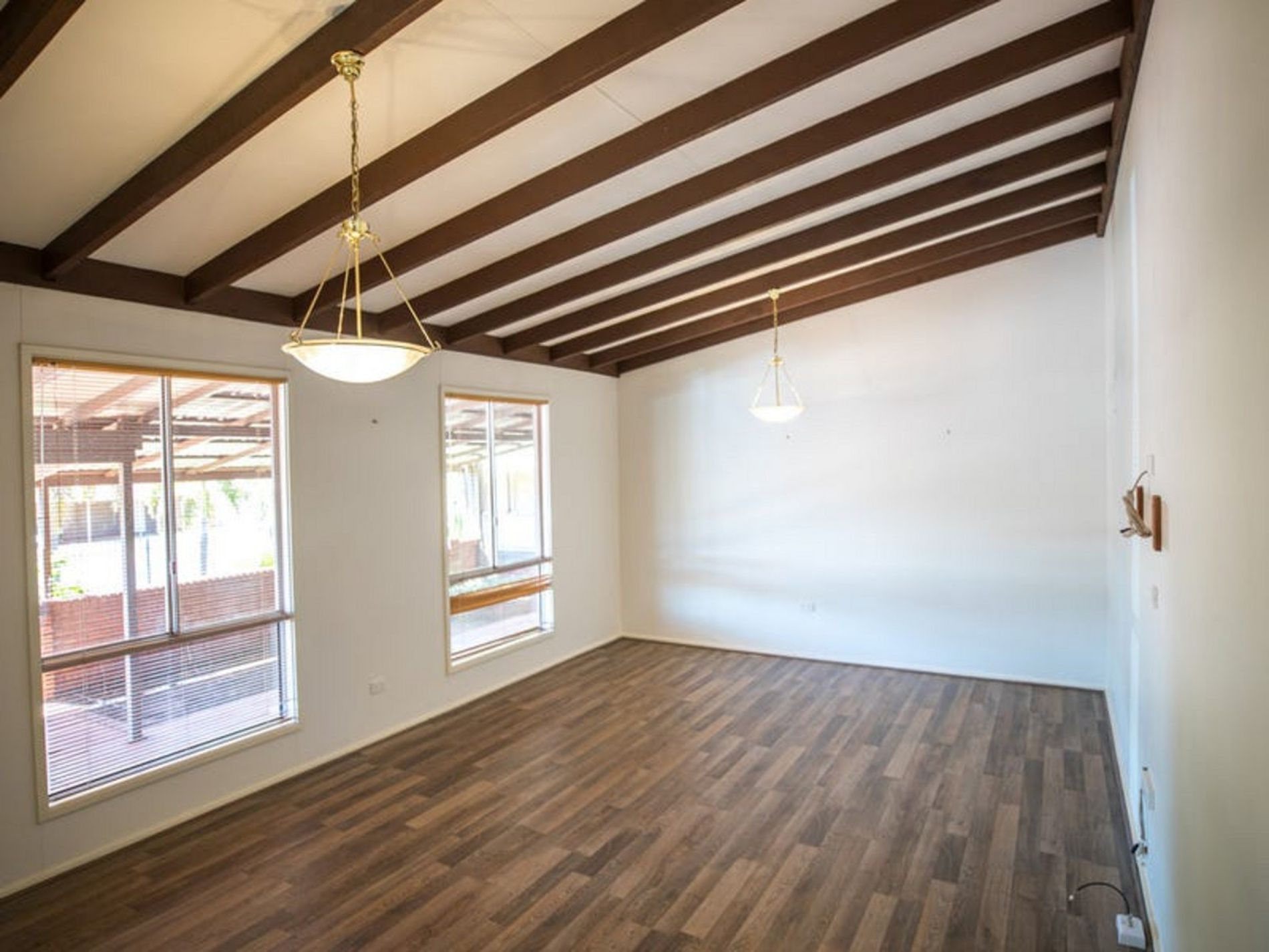 Sunken loungeroom with exposed beams