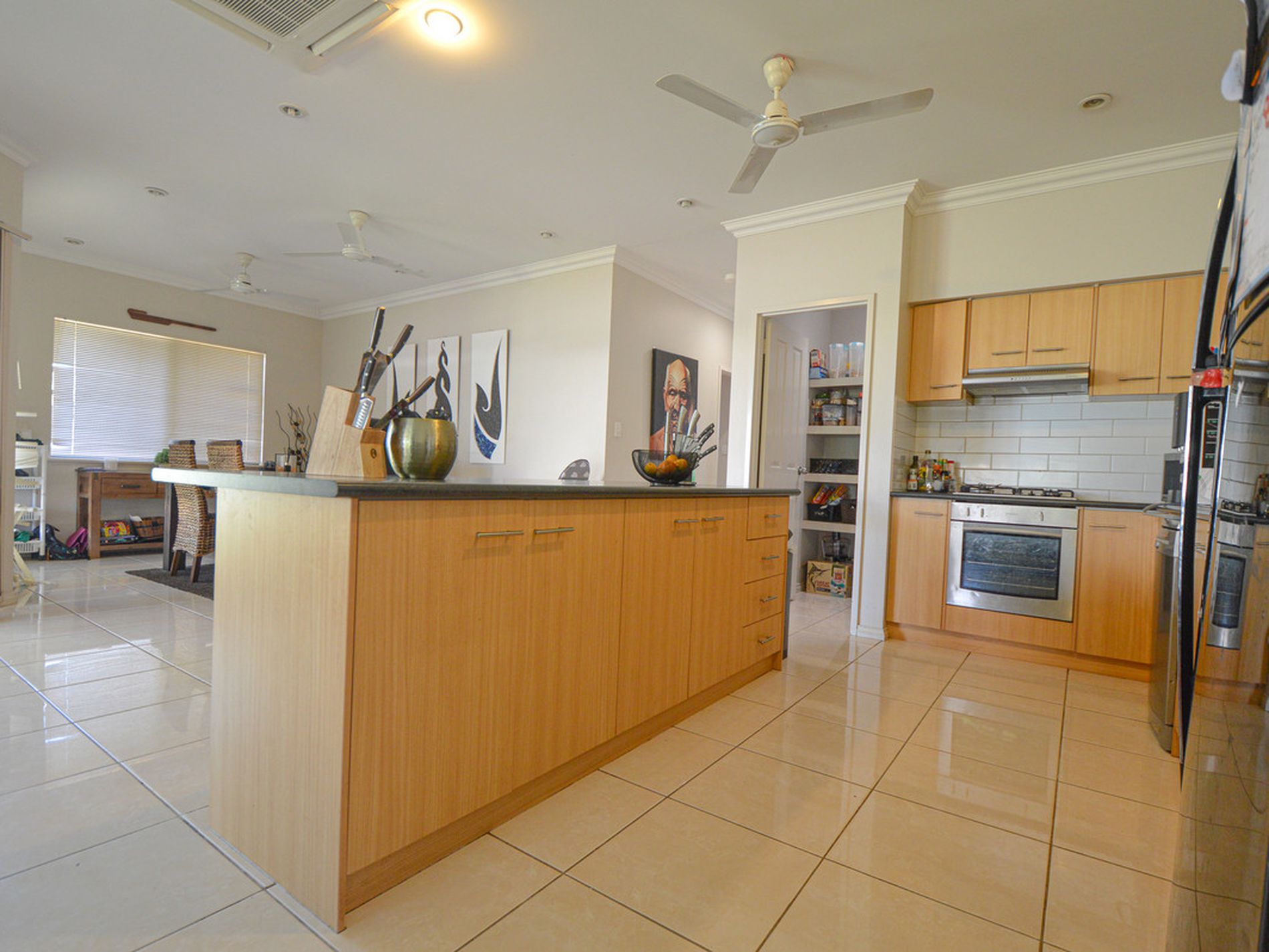 Large open plan tiled living and kitchen areas