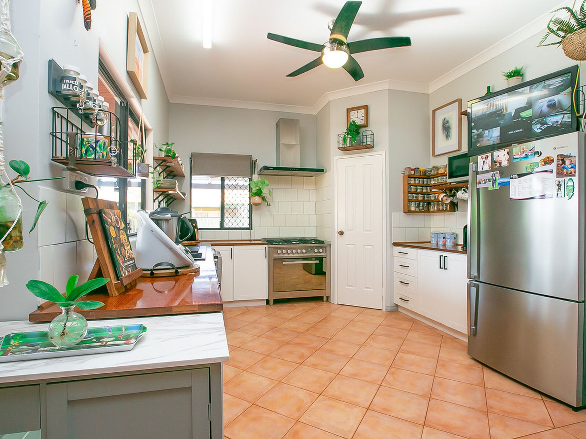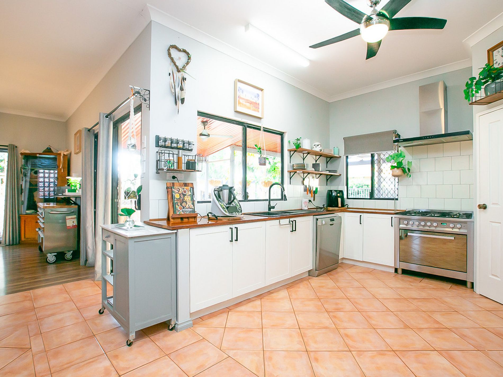 - Massive, Updated and modern spacious kitchen, complete with 5 burner gas stove, 900mm oven, Crisp white oversized subway wall tiles, stainless steel appliances complimented by matt black fittings and fixtures, ample storage options and walk in pantry. Kitchen overlooks the outdoor entertaining area and pool and opens to the large open plan dining, living and alfresco entertaining areas