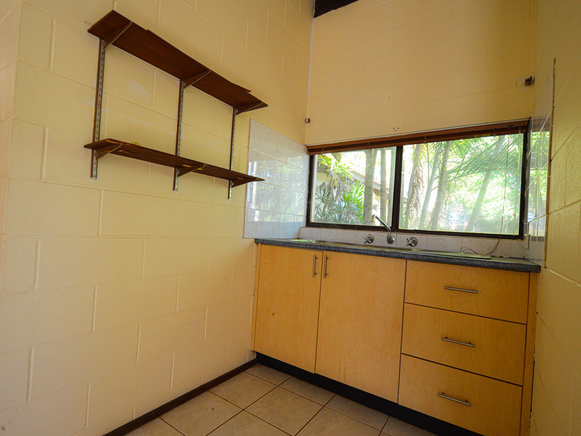 Studio is tiled with bathroom and kitchenette