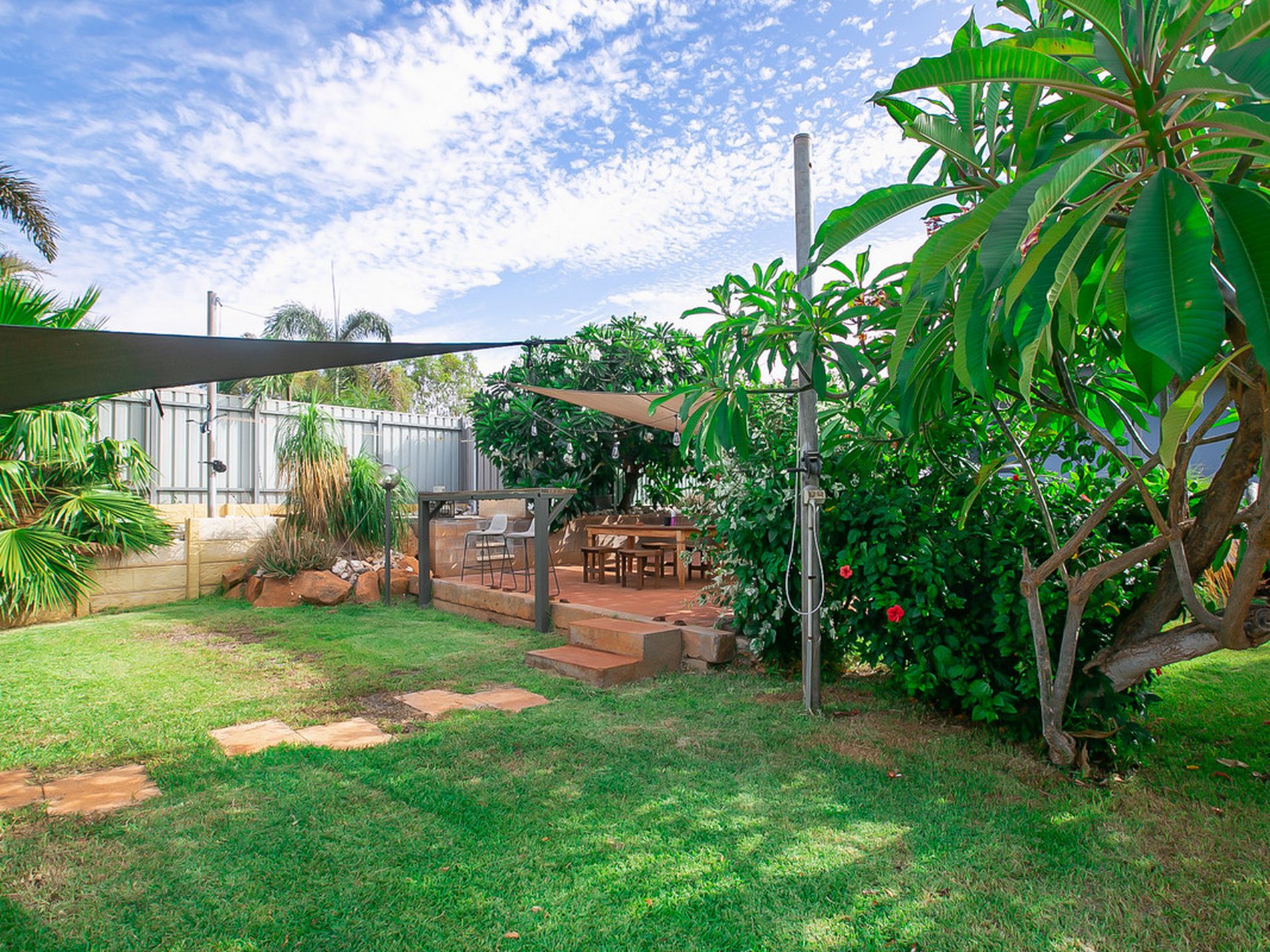 - WELL ESTABLISHED Tropical gardens surrounds the entire home - front and back - all serviced by retic for low maintenance and easy upkeep! Loads of grass for the fur babies and children to enjoy!