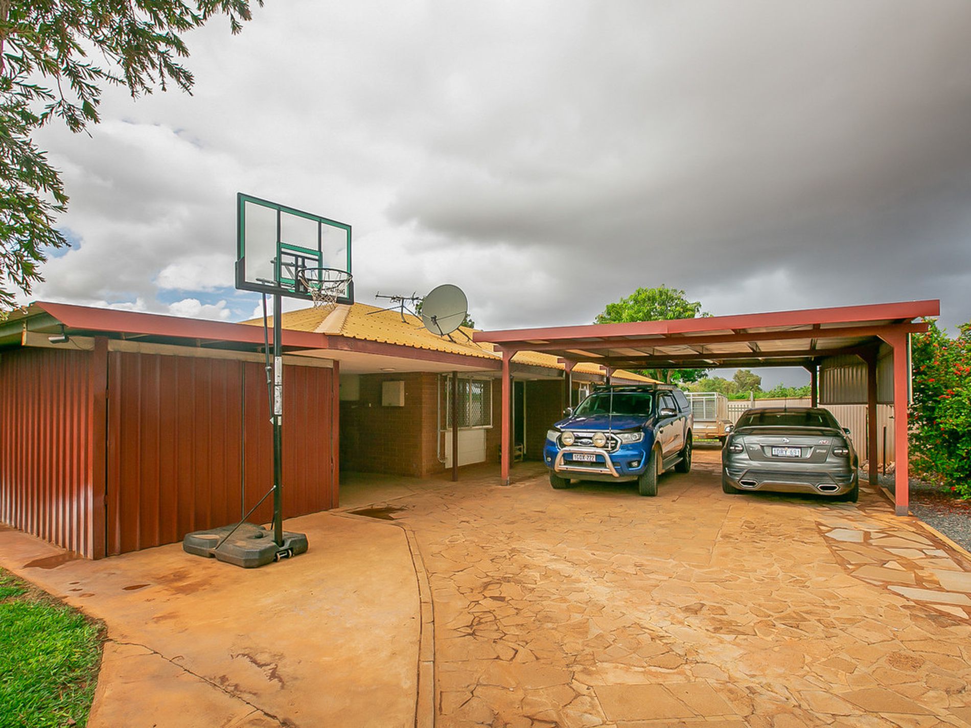 Double undercover carport at the front of the home - drive thru access access allows for MULTIPLE options to park multiple cars, boats, trailers all within the fence lines!