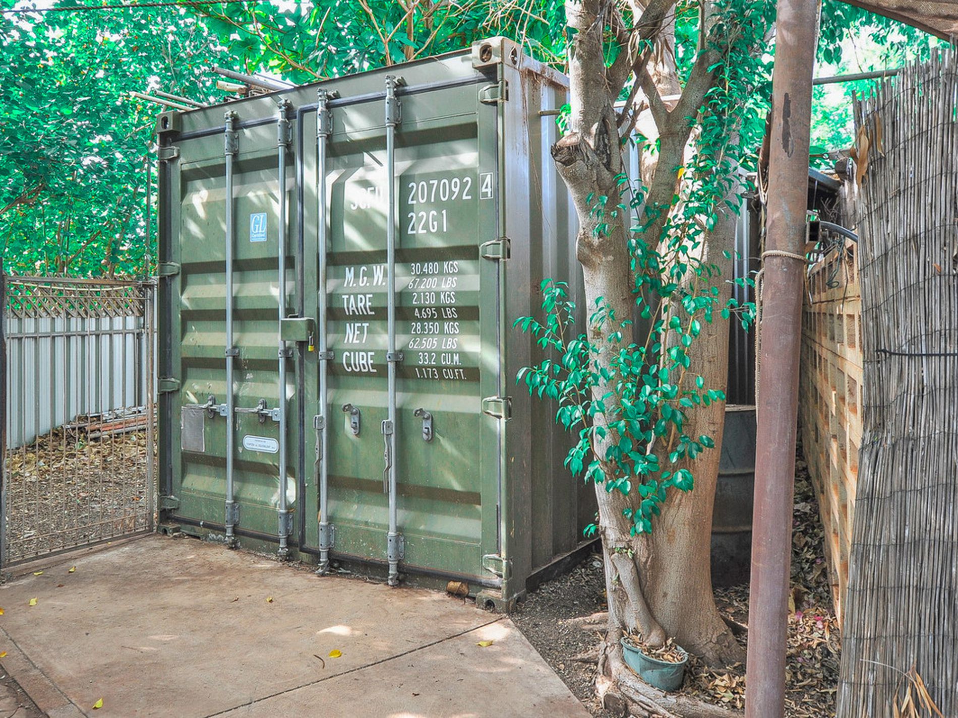 - Garden shed plus a large sea container offers loads of "shed space" for dad until he builds his "DREAM Man Cave"