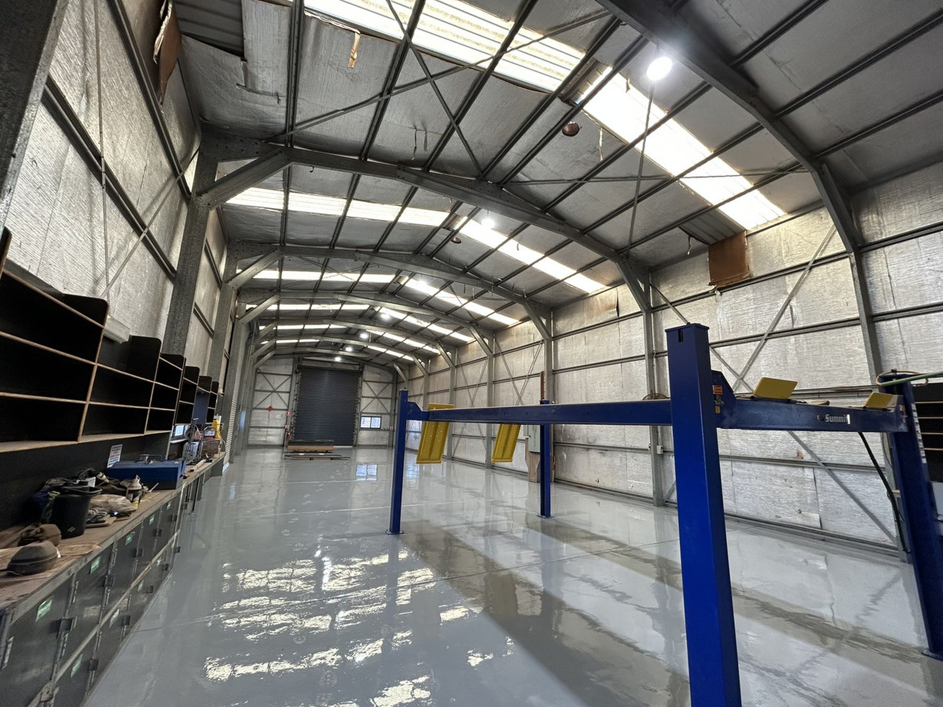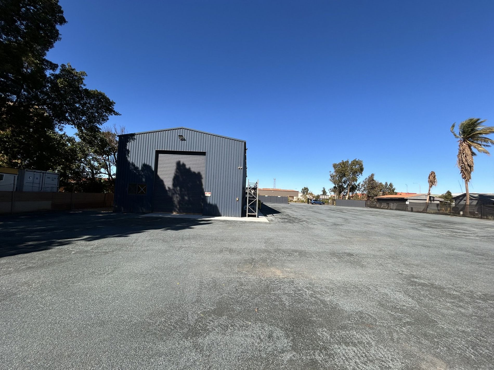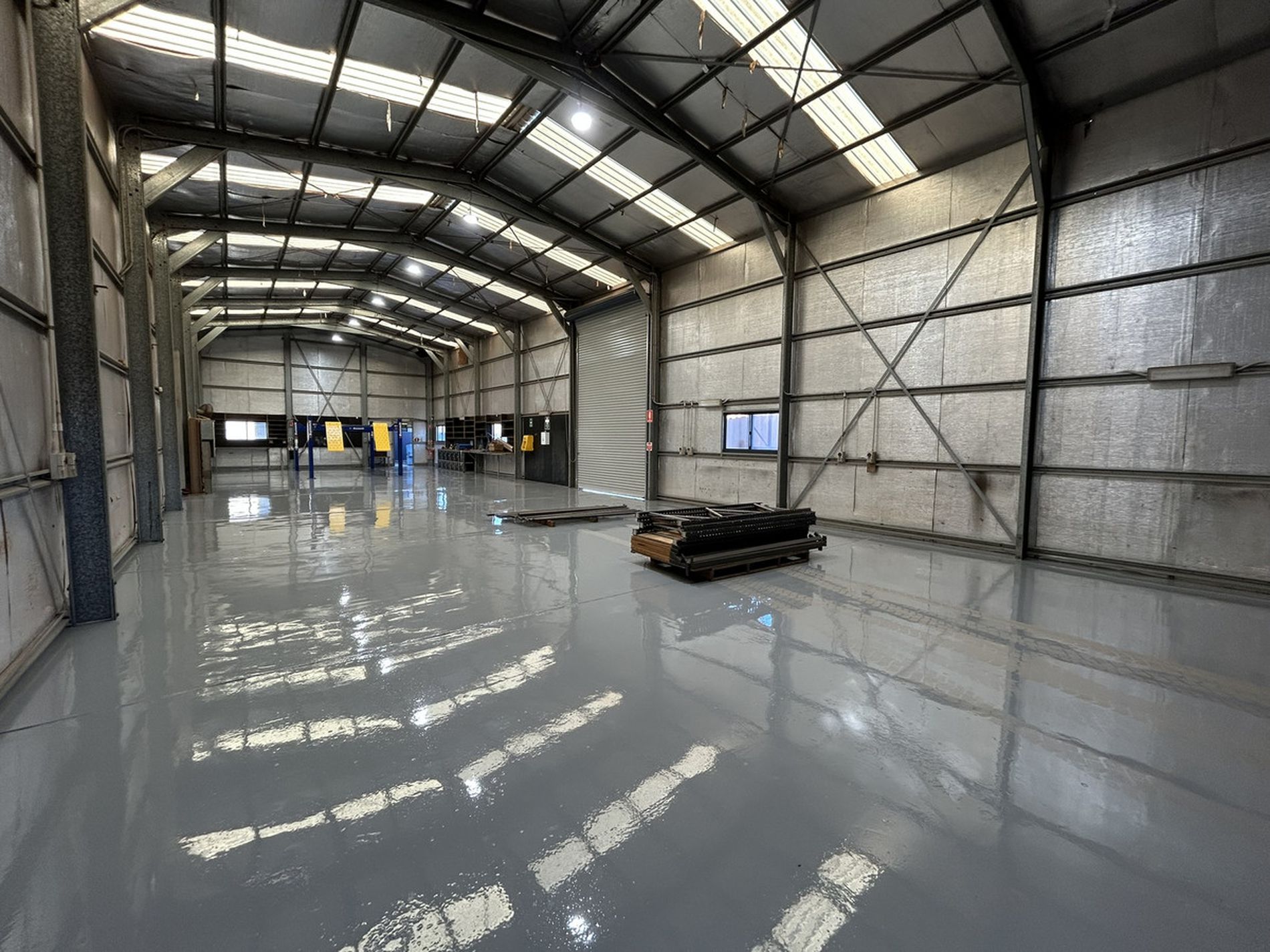 300 sqm (approx.) modern colourbond workshop, side and rear roller doors, racking