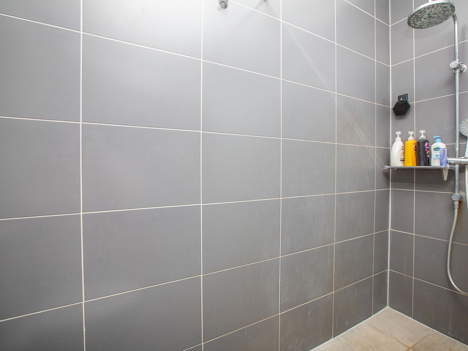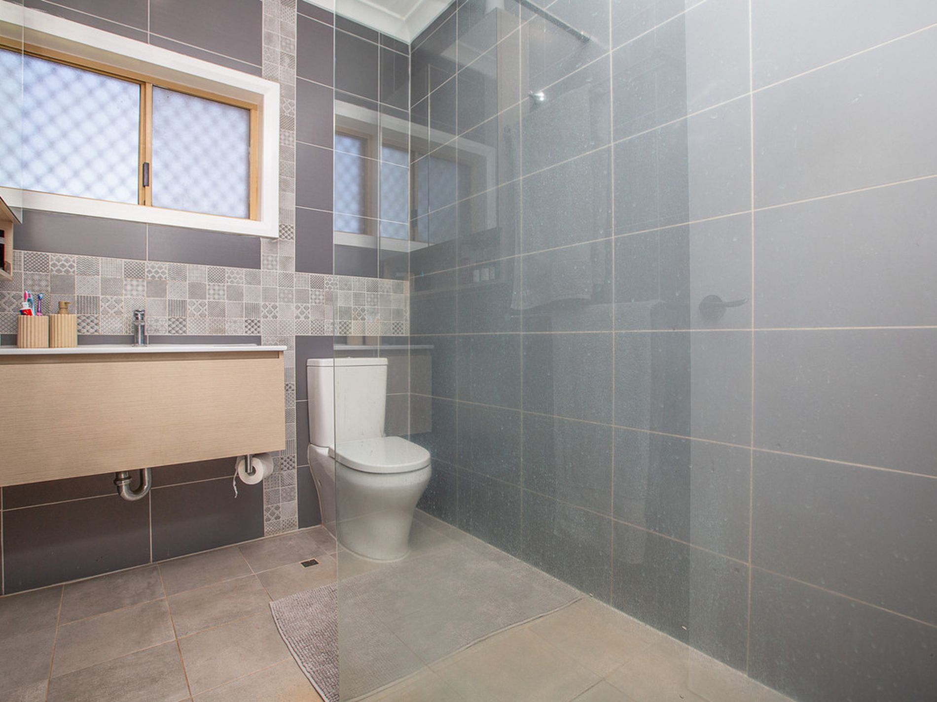 Beautifully renovated main bathroom with floor-to-ceiling feature tiles, floating vanity, mirrored cabinetry, downlights, oversized rainfall shower, and second toilet