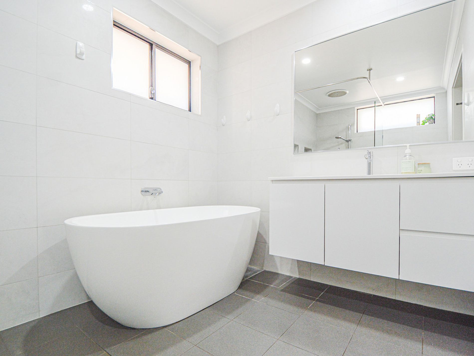 - STUNNING and WOW Factor BRAND NEW renovated bathroom - complete with full size free-standing EGG bathtub, Large separate shower, toilet, Floating vanity, oversized mirror and complete with super modern and stylish floor and wall tiles! This bathroom is WOW and is one to envy!