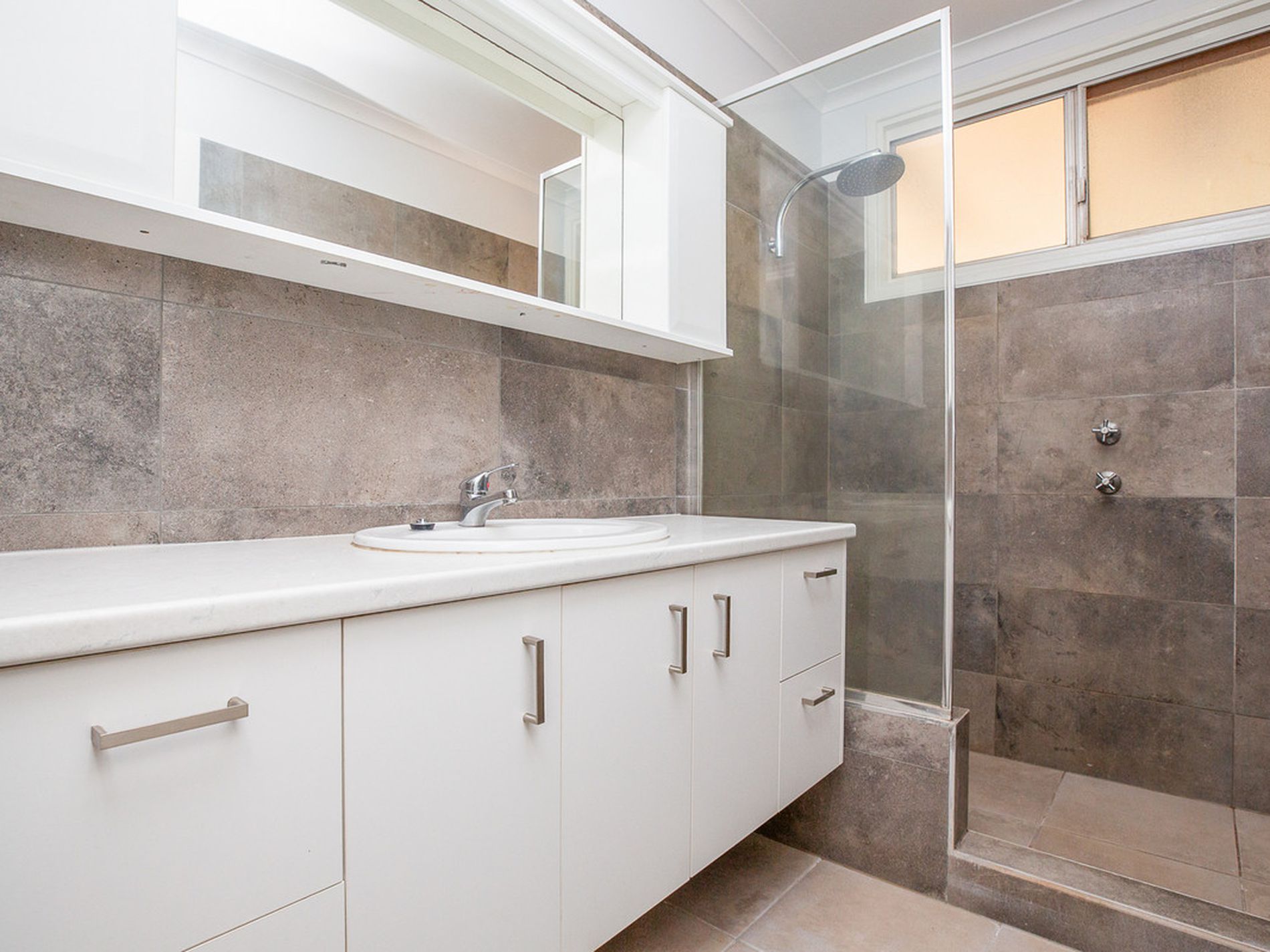 - Stylishly renovated bathroom featuring rainfall shower, floating vanity, and modern finishes