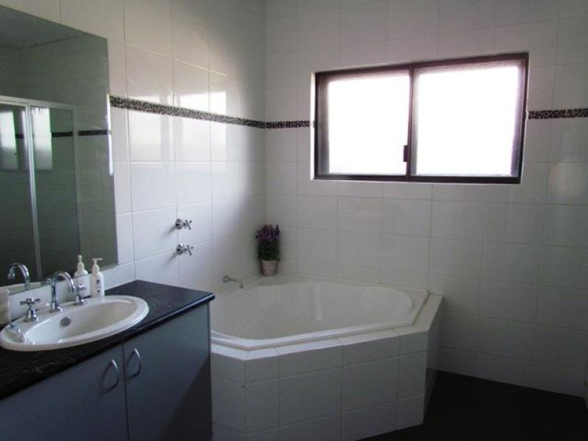 - Floor to roof tiled bathroom with corner bath