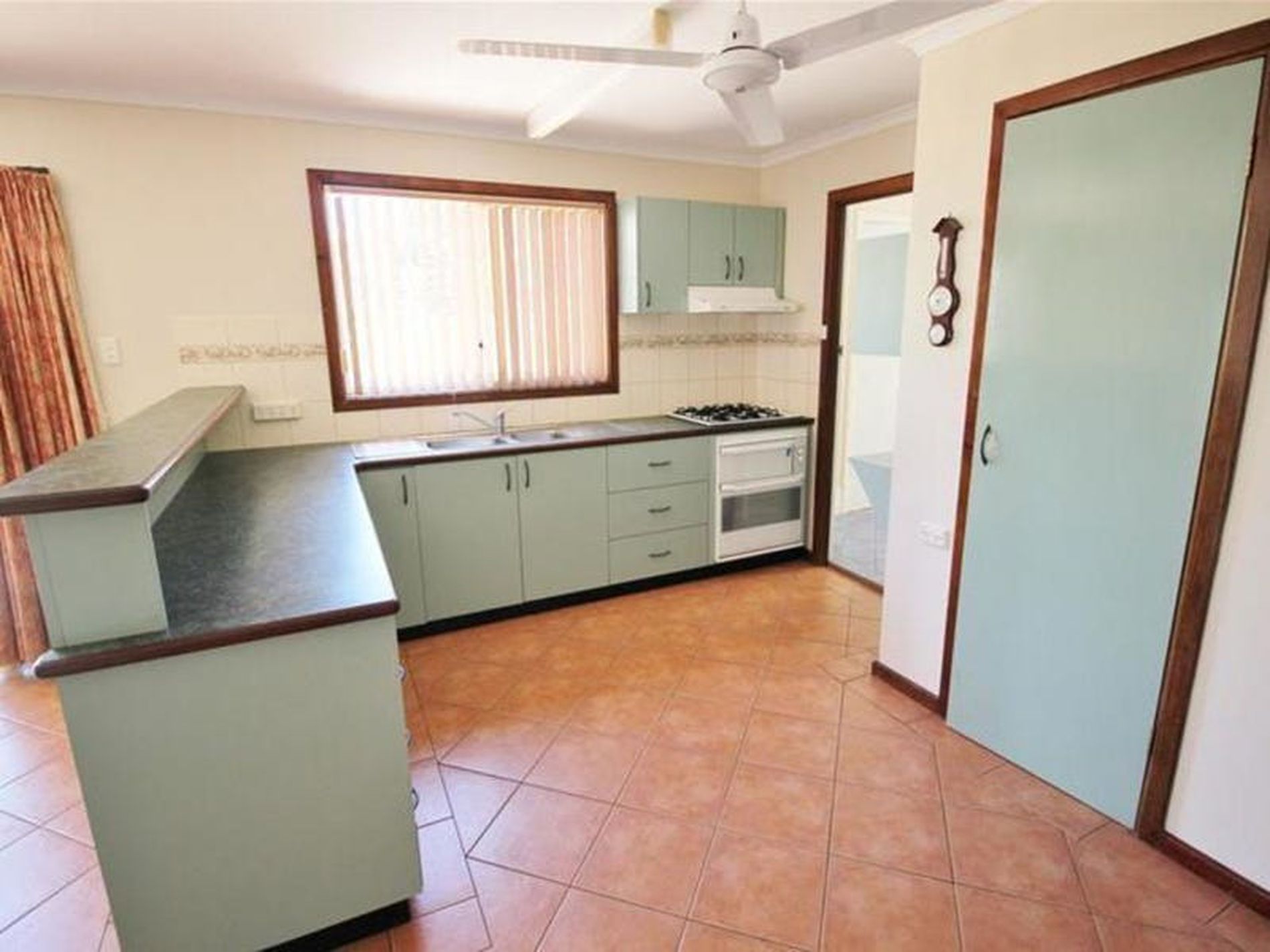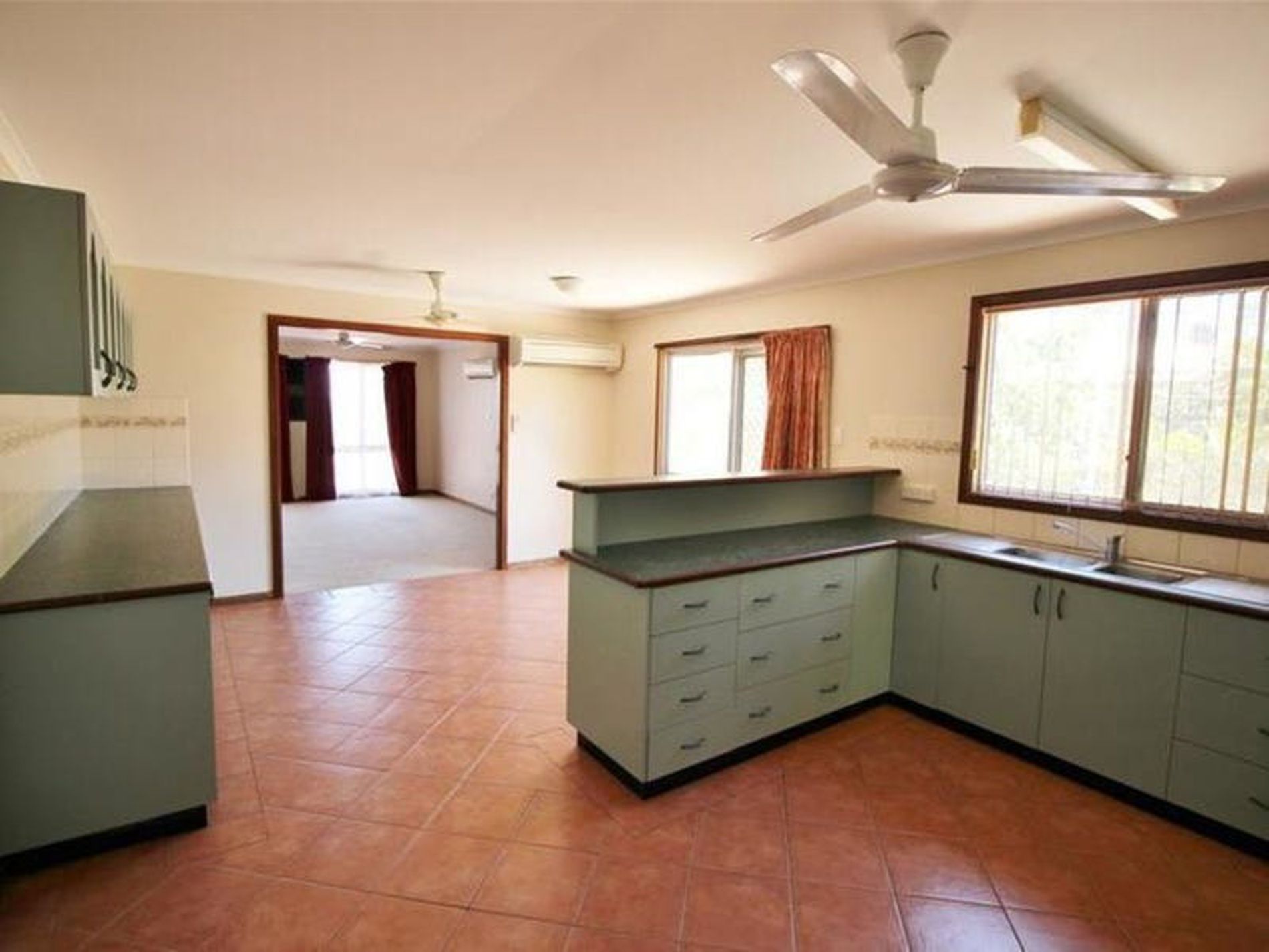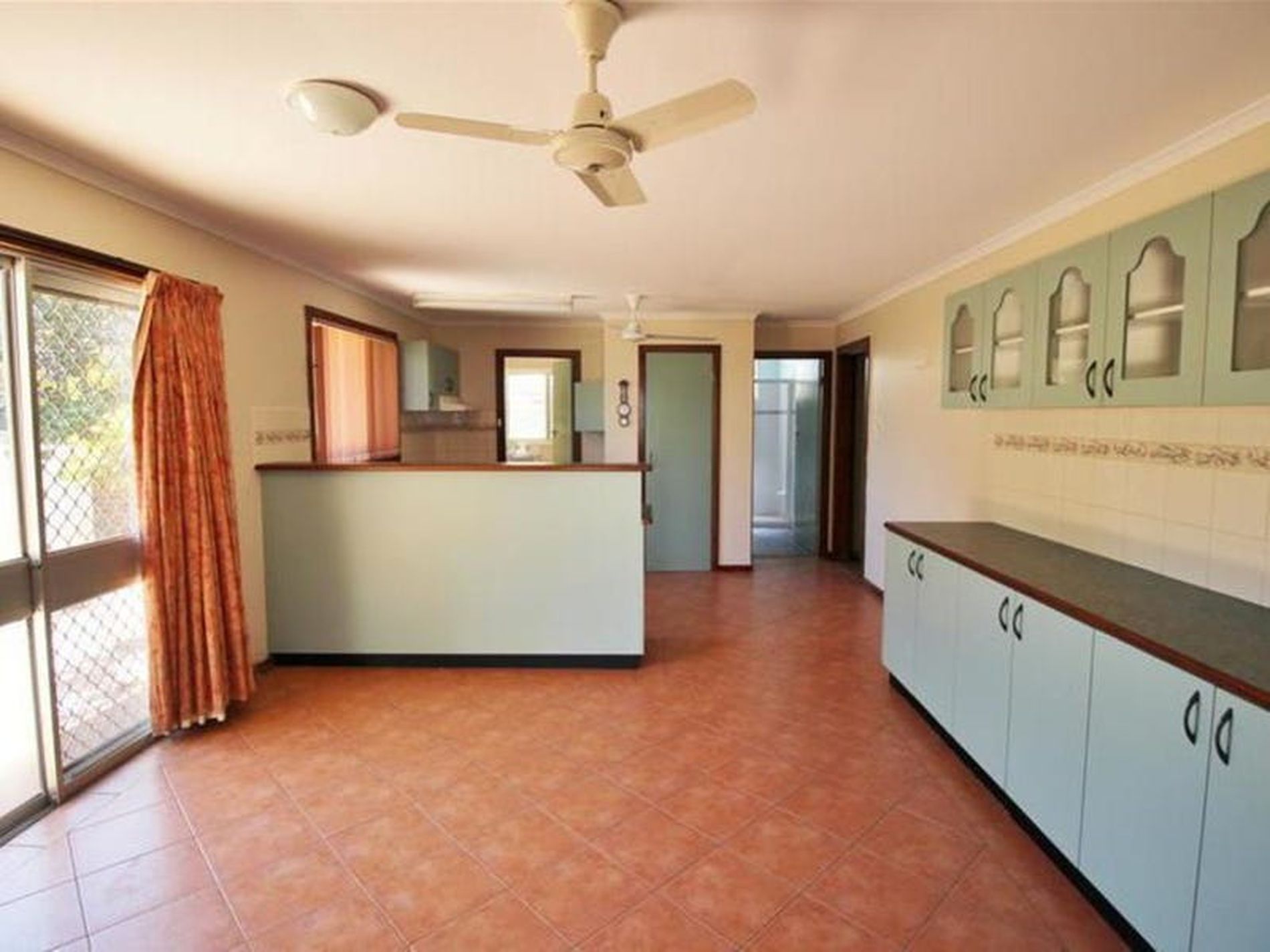 Large tiled kitchen and dining areas