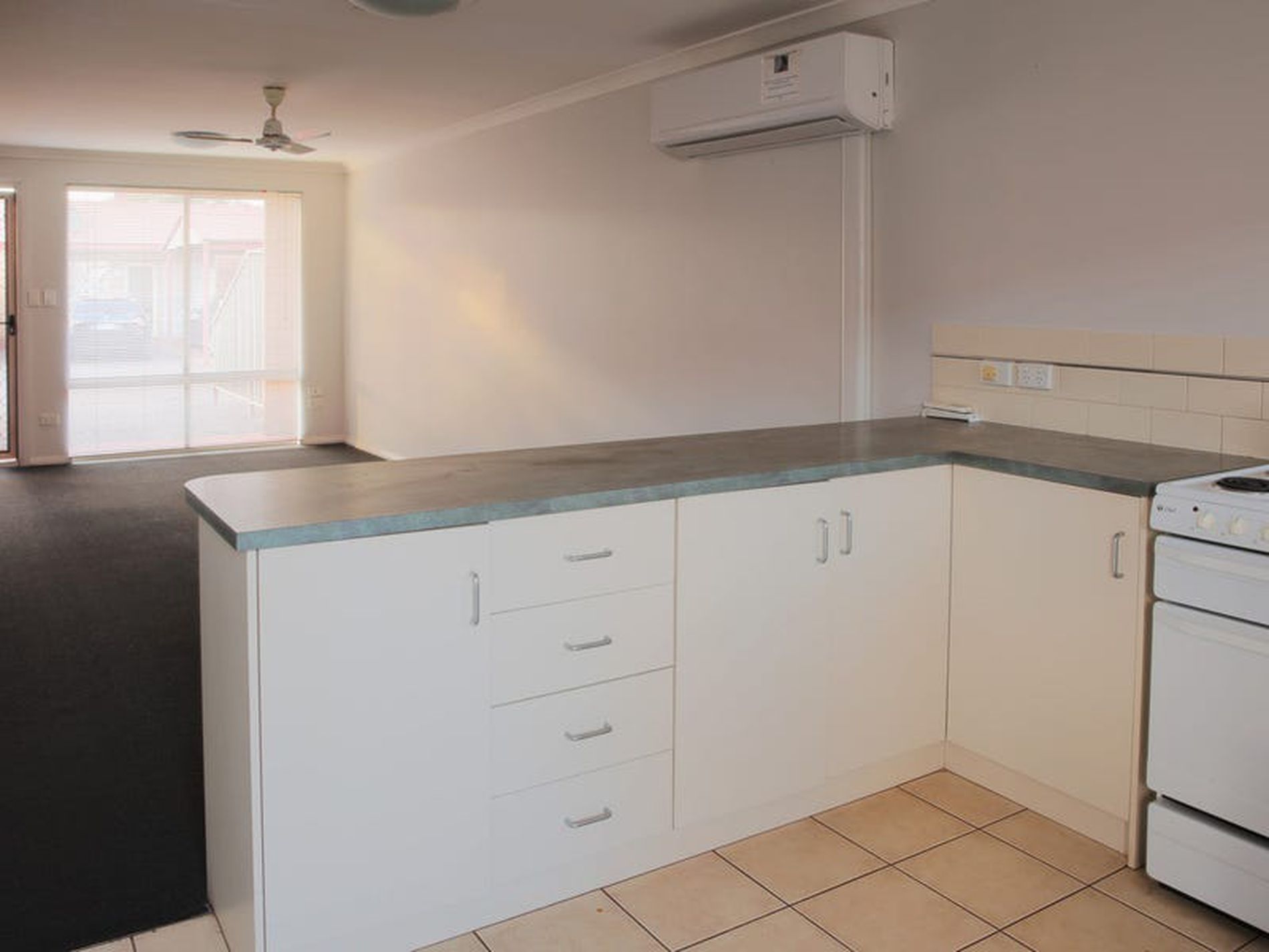Tiled kitchen with carpets to lounge and bedrooms