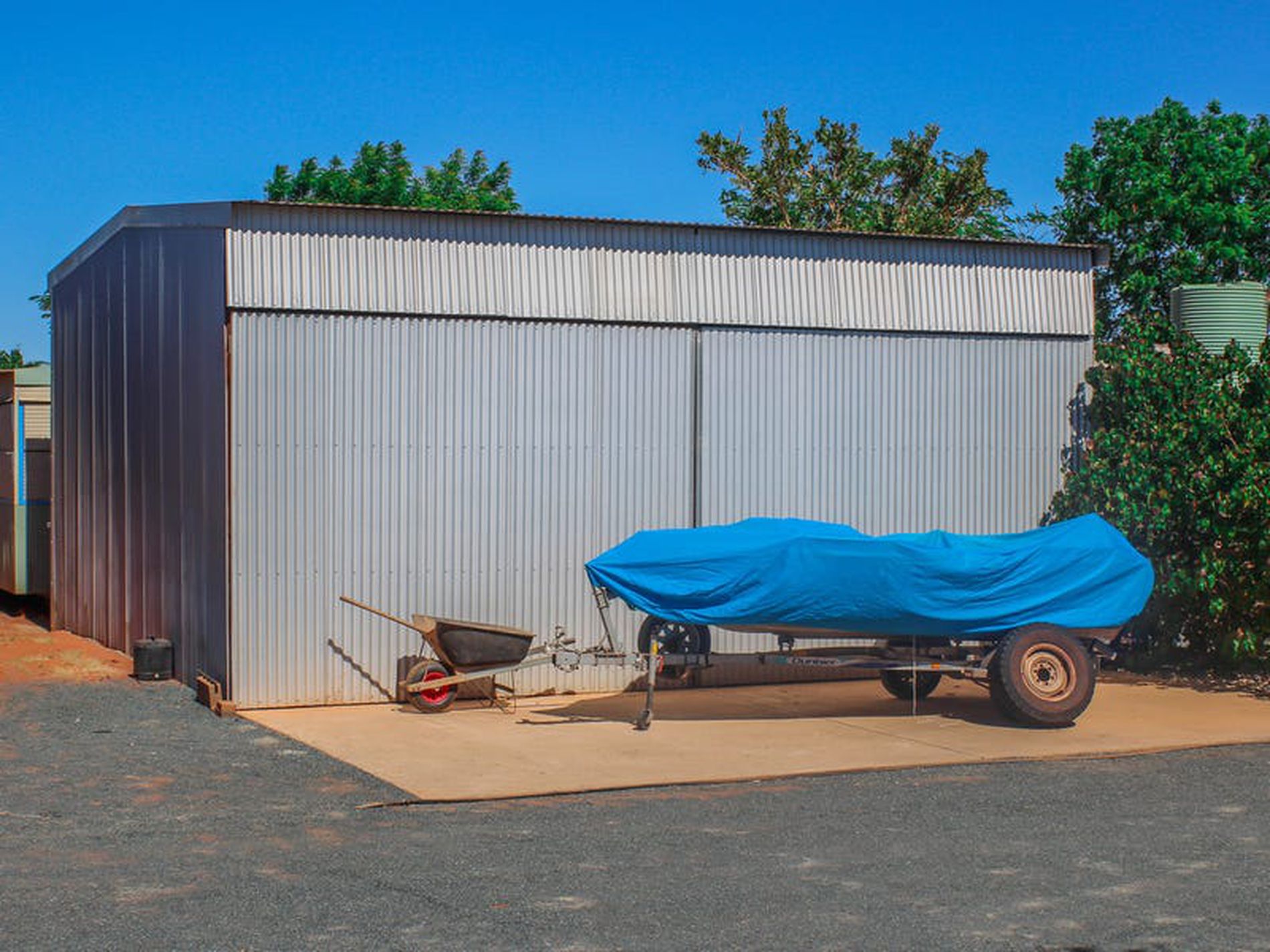 - Enclosed workshop area 10x12m with 5m sliding door, concreted, natural light via opening windows