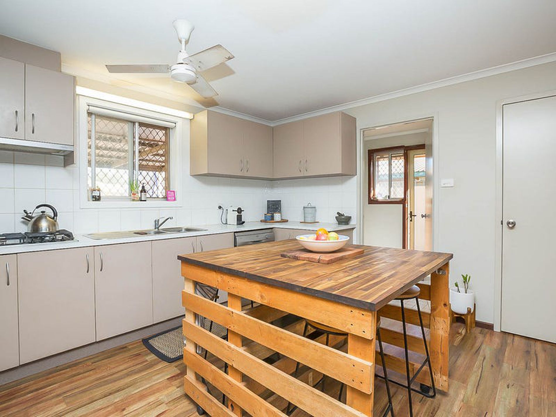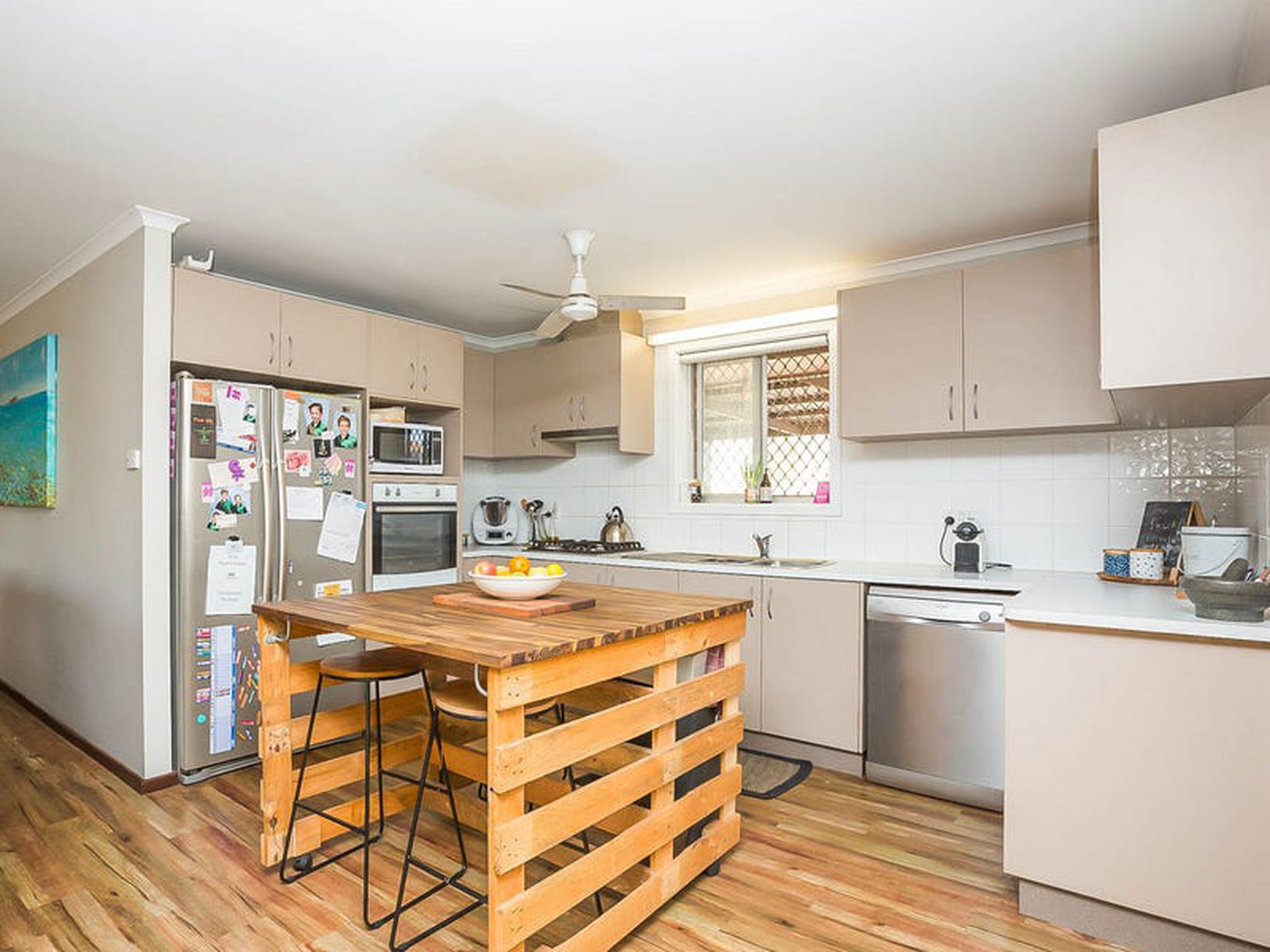 - Modern spacious kitchen, complete with stainless steel appliances, Gas stove tops and ample storage options - Custom made and designed mobile island bench - ideal to use as a breakfast bar or for entertaining!
