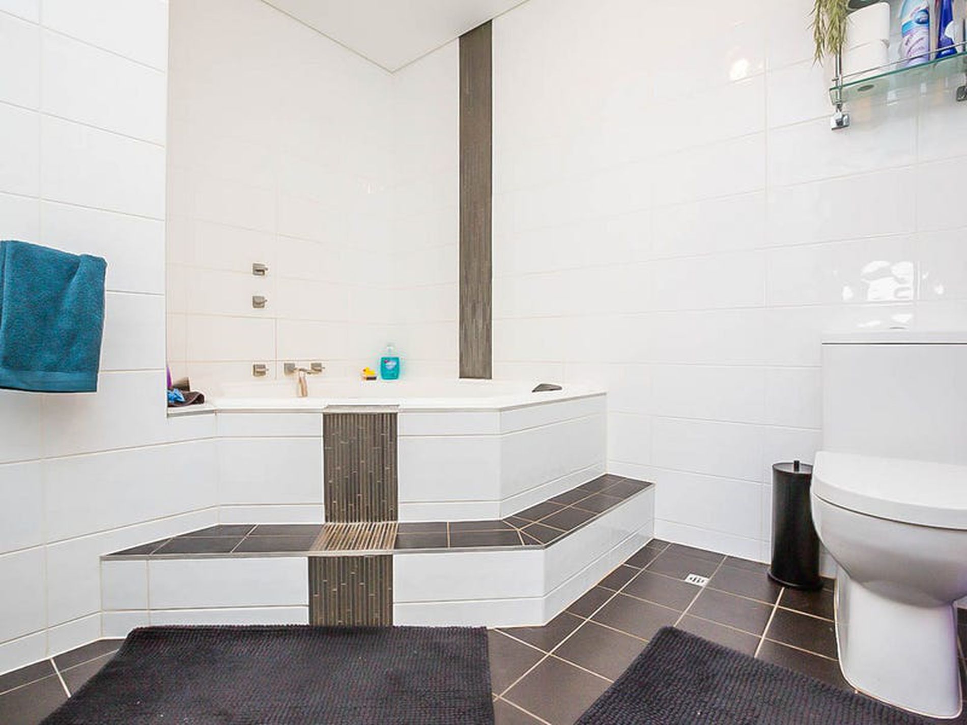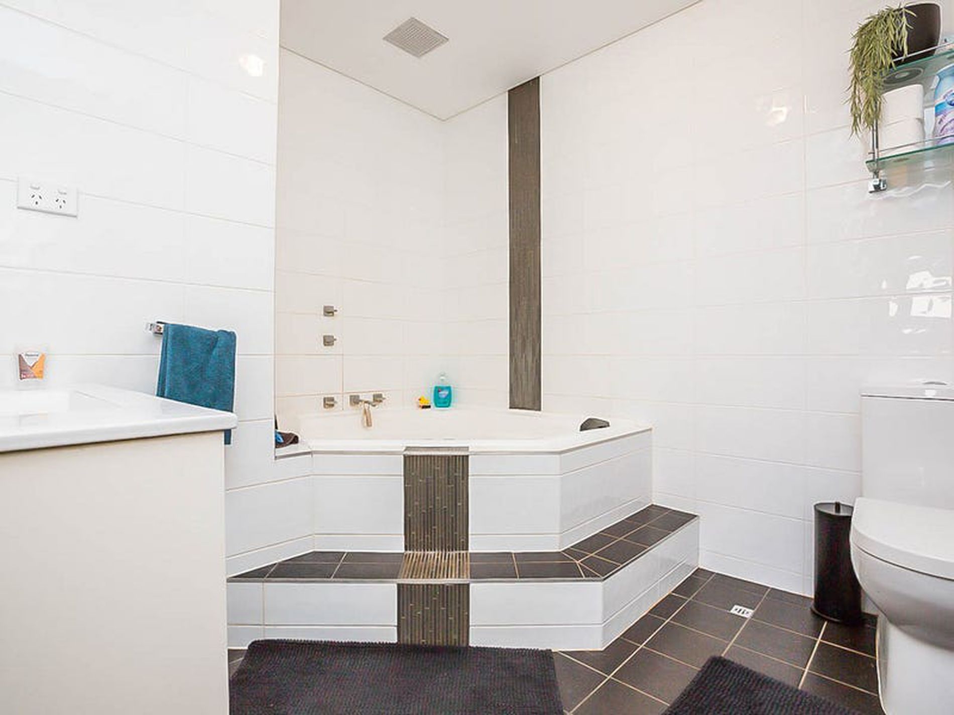 • Large renovated bathroom featuring a large corner spa bath
