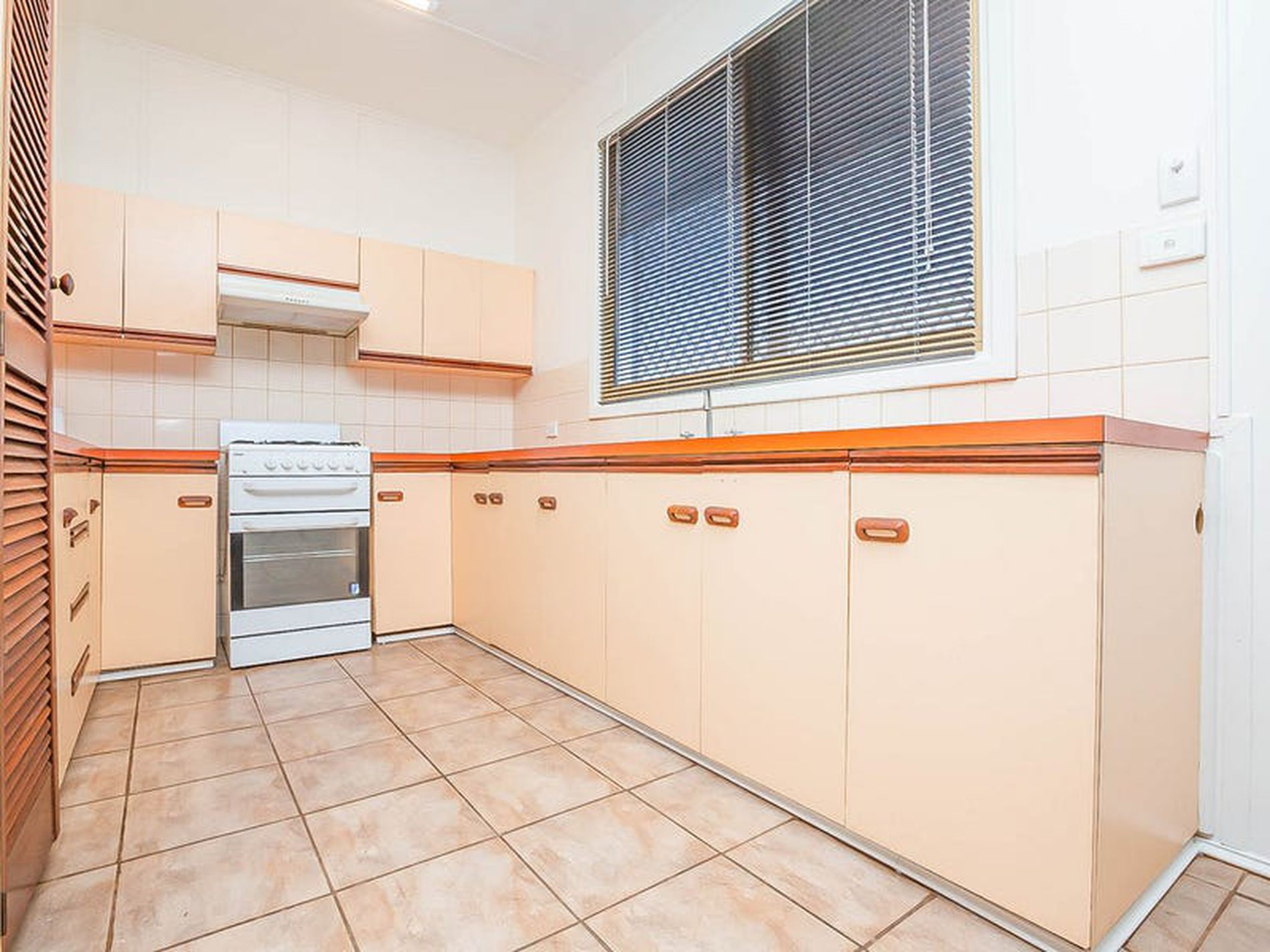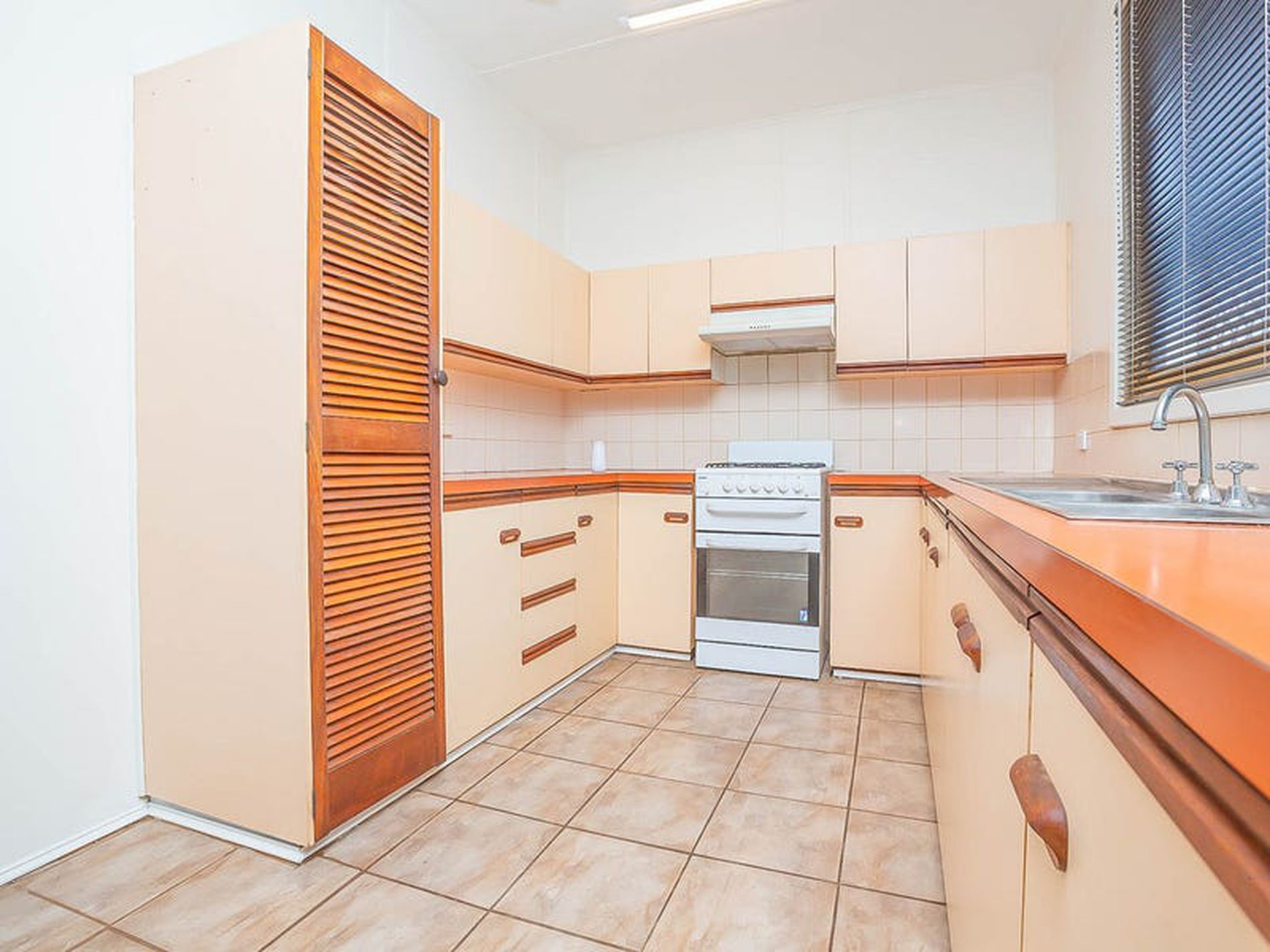 - Dated but tidy kitchen with gas cooking, ample storage solutions