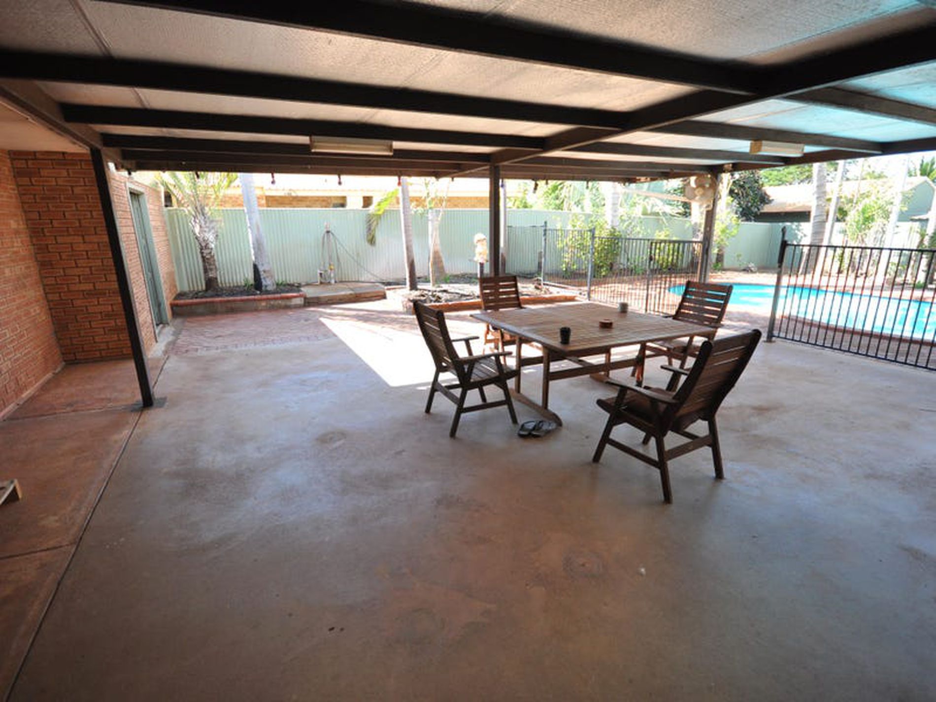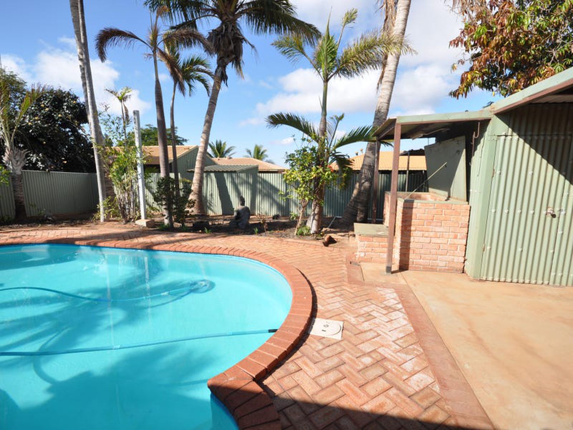 - Below ground pool, paved surrounds with shade sail covers
