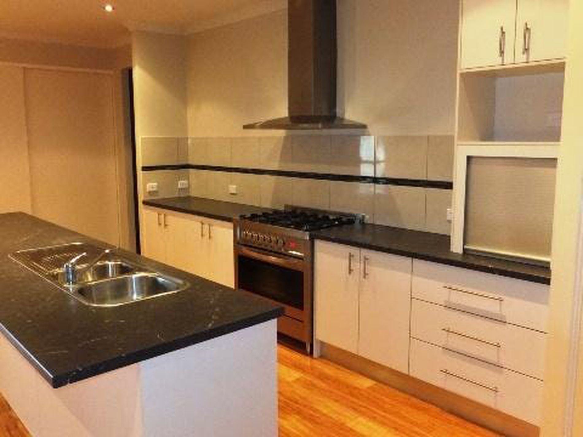 - Practical kitchen with long island bench and stainless steel appliances