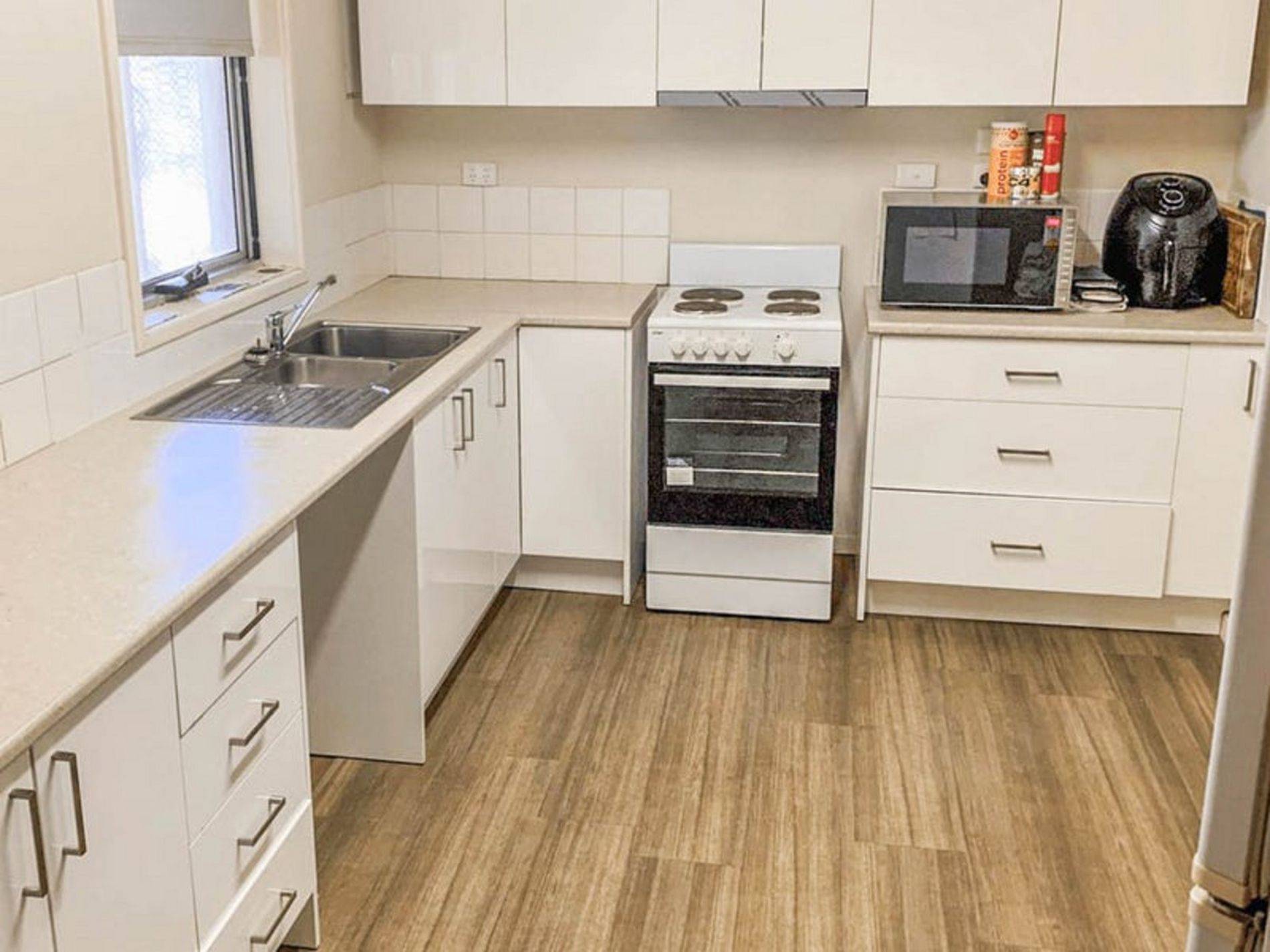 - Large 'L shaped' Dining and Living areas come off the kitchen - complemented by new wood look flooring throughout!