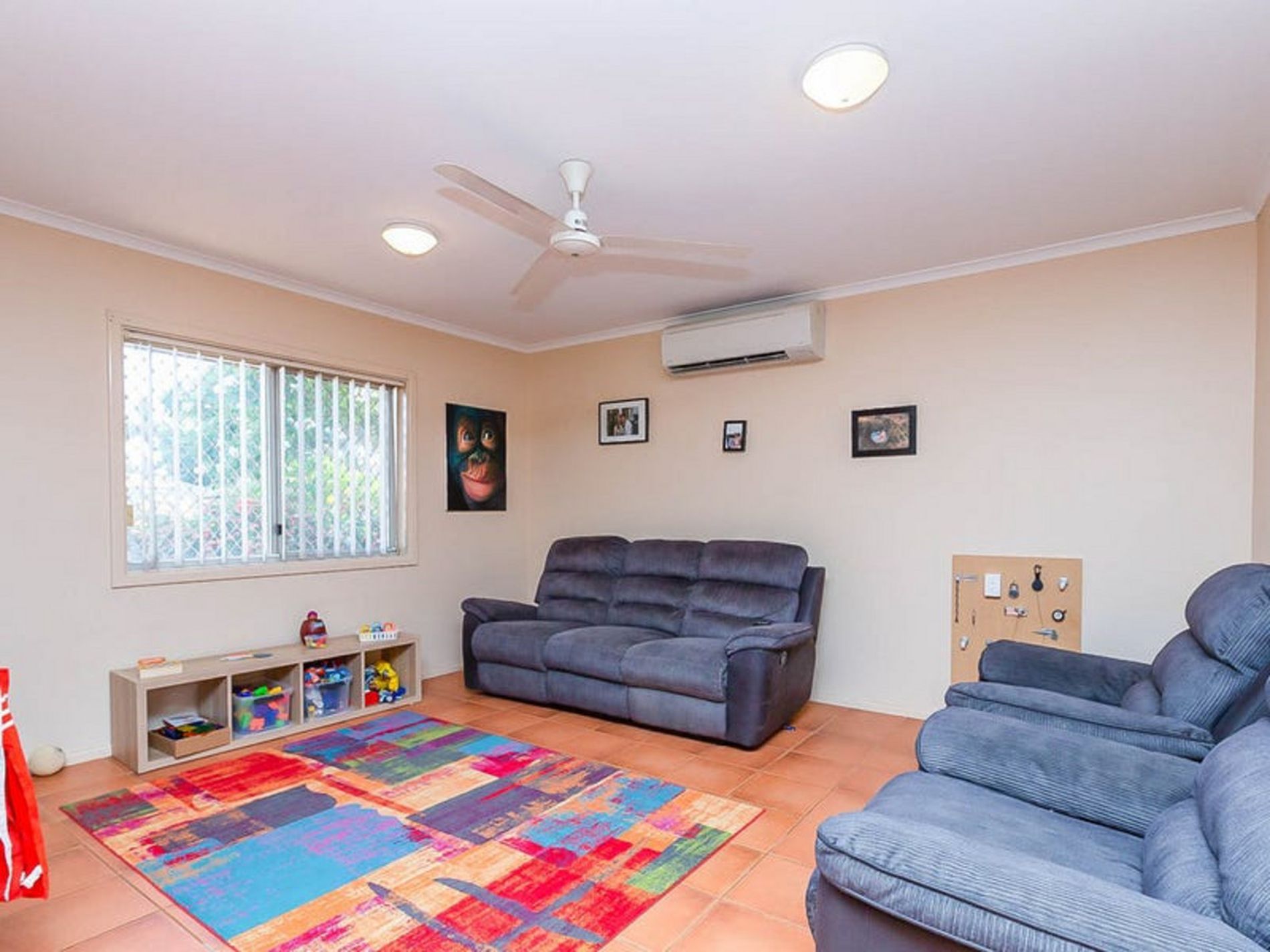 - Fresh and neutral wall colours, quality and hardy floor tiles, window treatments, ceiling fans and split system air conditioning throughout